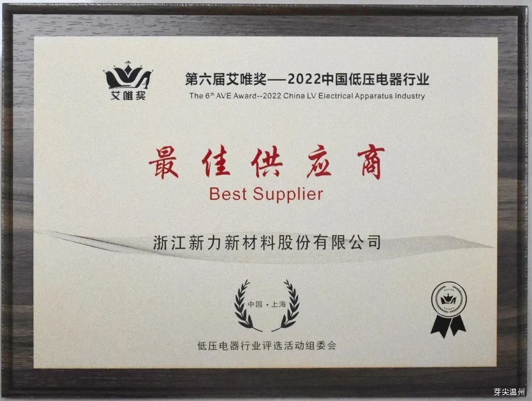 5月18日,以“數字化轉型 開啓綠色未來”爲主題的2023年杭申·人民電器杯第六屆“艾唯獎”評選活動頒獎典禮暨首屆新能源電器行業創新發展峰會在上海隆重舉行,新力新材憑借着在供應鏈管理和服務質量方面的突出優勢,榮獲低壓電器行業“最佳供應商”稱号。